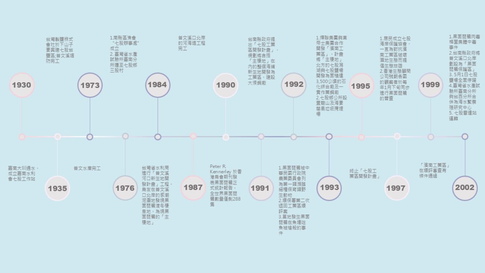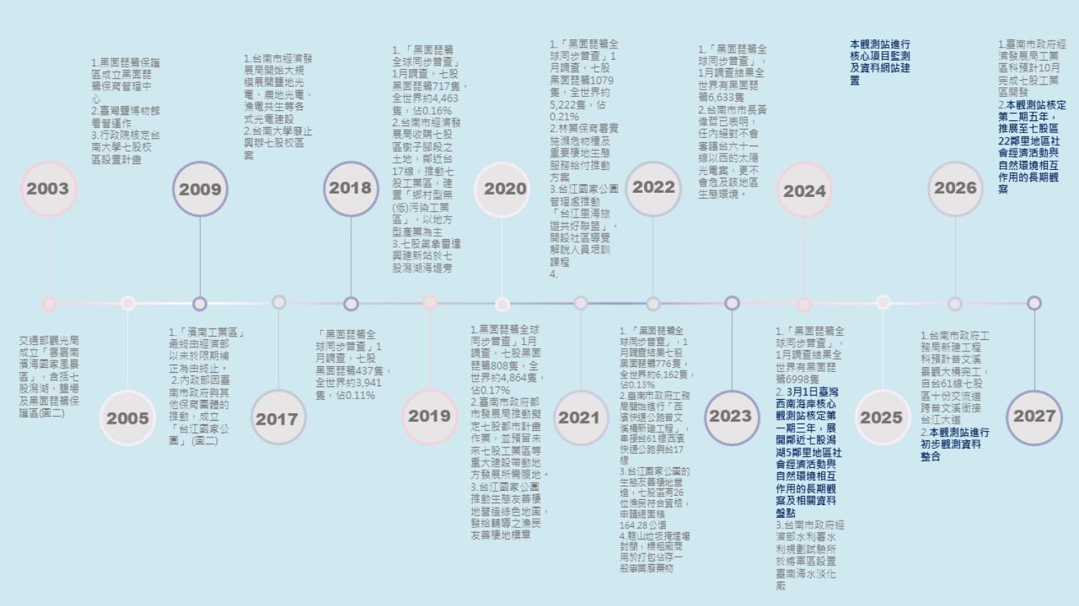 圖六、七股區1930-2027年推動計畫案與黑面琵鷺生態保育時間圖。