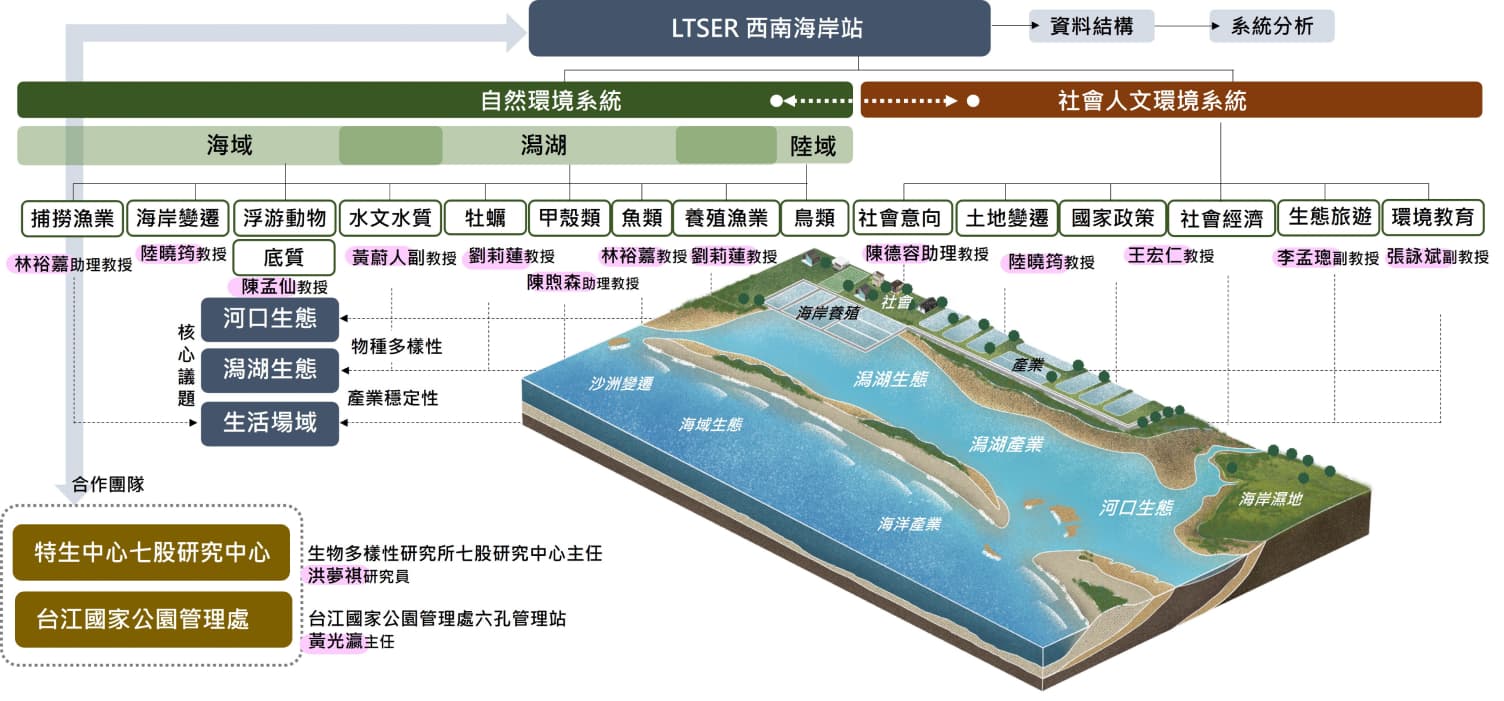 圖一、LTSER西南海岸站各領域計畫共同主持人跨領域合作的監測項目