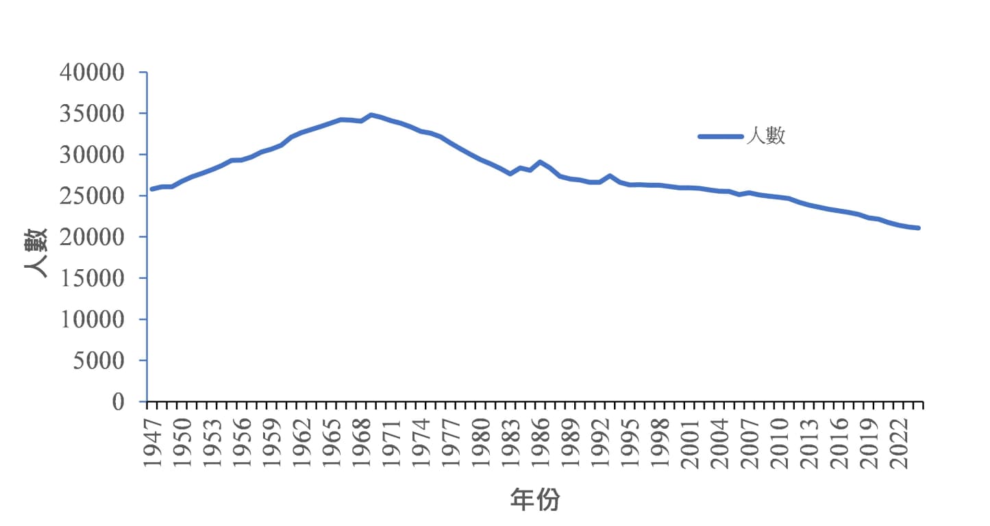 圖四、1947-2024年七股區人口數變化。資料來源: 七股鄉誌及臺南市佳里戶政事務所。