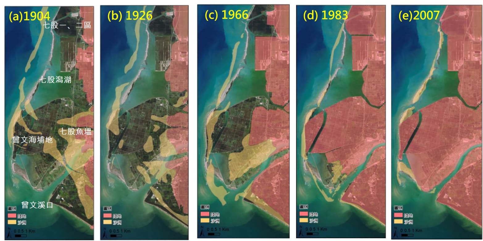 圖五、1904-2007年台江沿海沙洲變遷圖。(a)1904年台灣堡圖; (b)1926年台灣地形圖; (c) 1966年聯勤地形圖;(d)1983年像片基本圖二版; (e) 2007年福衛二號影像(資料來源:林等人, 2013)。